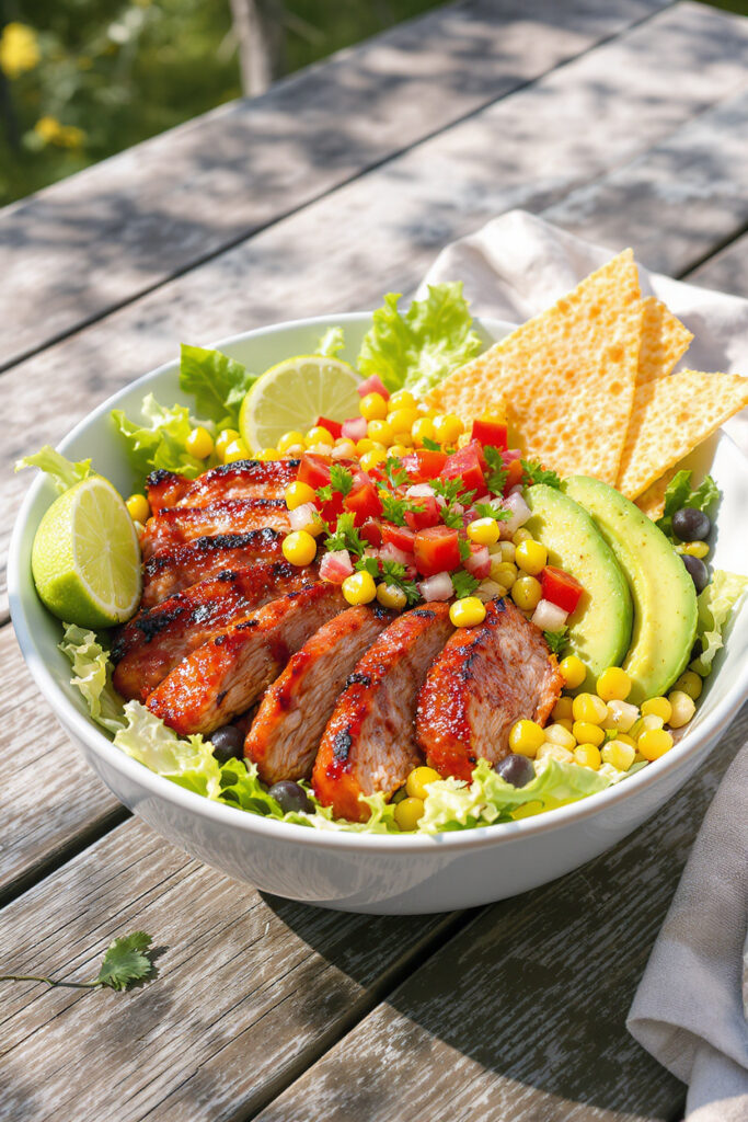 A reliable, crowd-pleasing bowl: crisp greens, juicy BBQ chicken, sweet corn, tomatoes, and a creamy ranch drizzle. Great for lunch or dinner.
