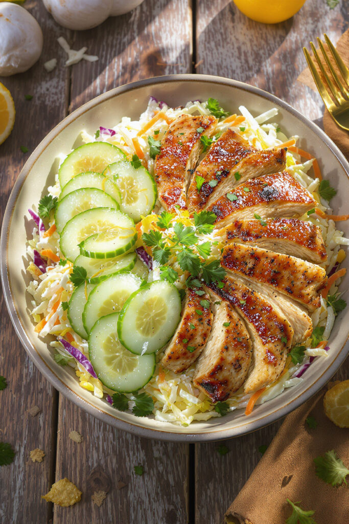 This one leans crunchy and bright: sesame slaw, carrots, and cucumbers with BBQ chicken on top. It’s sweet-smoky plus fresh, with zero heaviness.