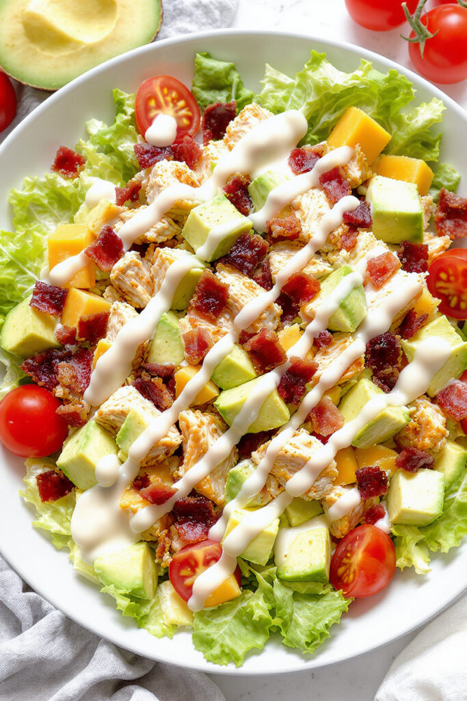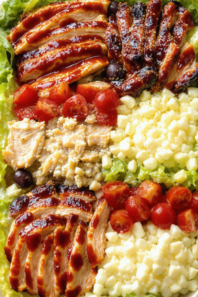 Cobb vibes, BBQ attitude: bacon, egg, avocado, and chicken stacked in neat rows. It’s protein-packed and perfect when you want a big dinner salad.