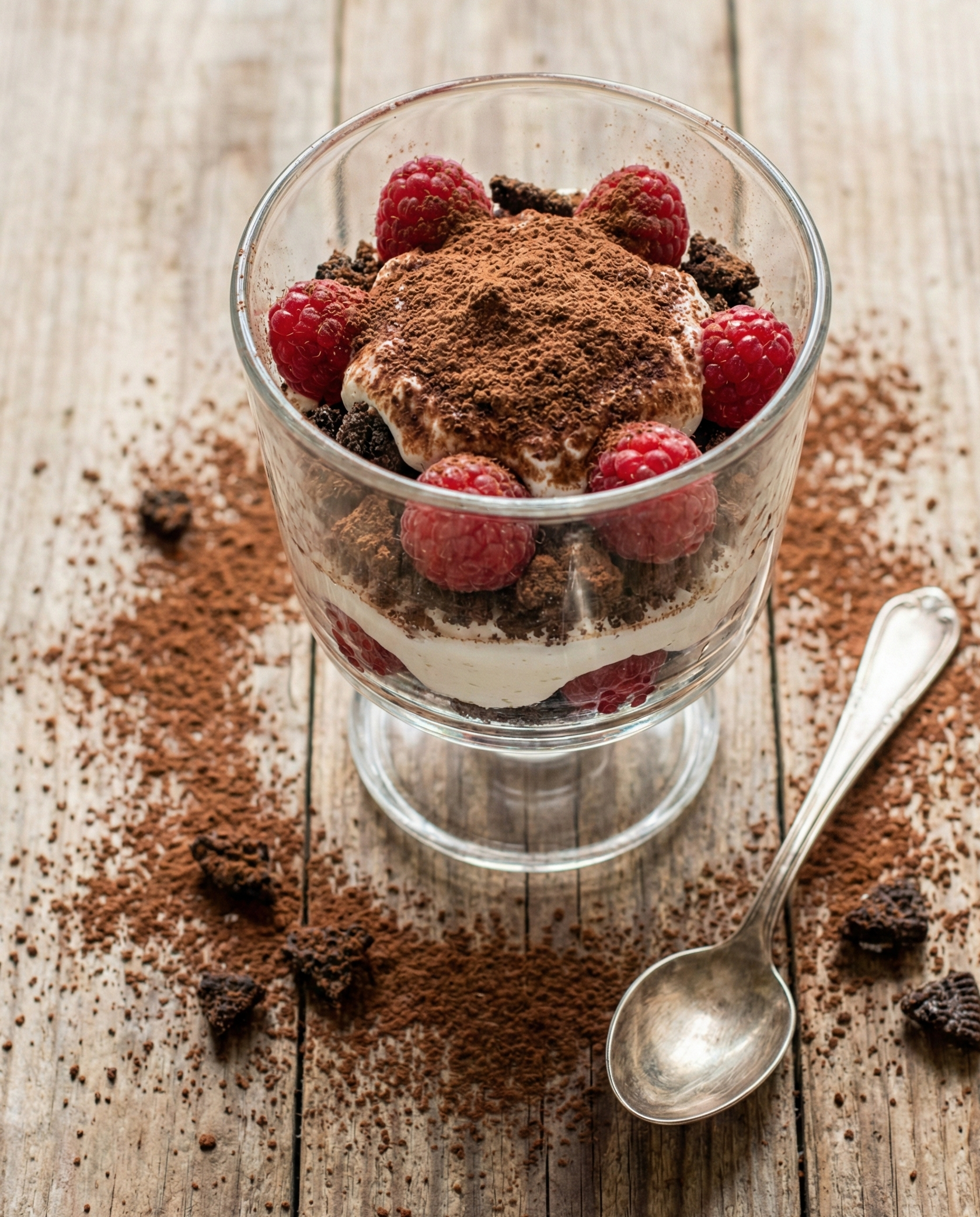 Description (20–30 words): A playful tiramisu-inspired cup: cocoa dusting, creamy cottage base, and tart raspberries. It’s not traditional, but it’s seriously satisfying.
