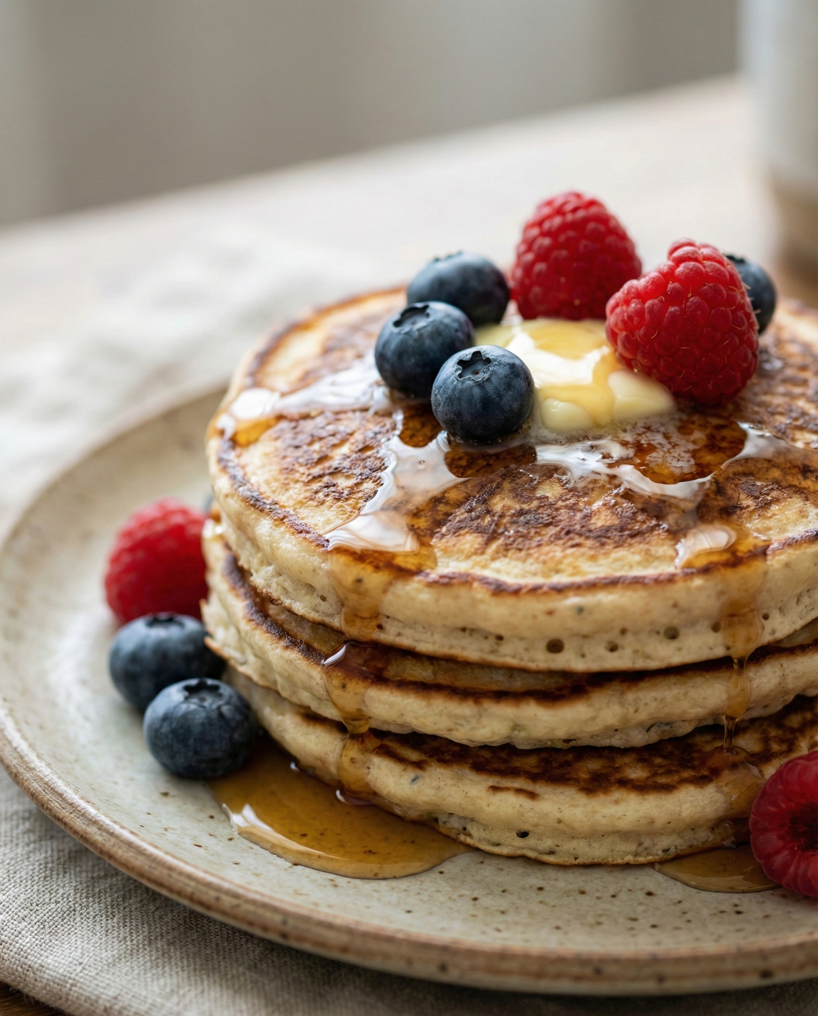 Description (20–30 words): Fluffy pancakes with cottage cheese in the batter turn into a dessert stack when topped with berries and warm syrup. Soft, tender, and crowd-friendly.