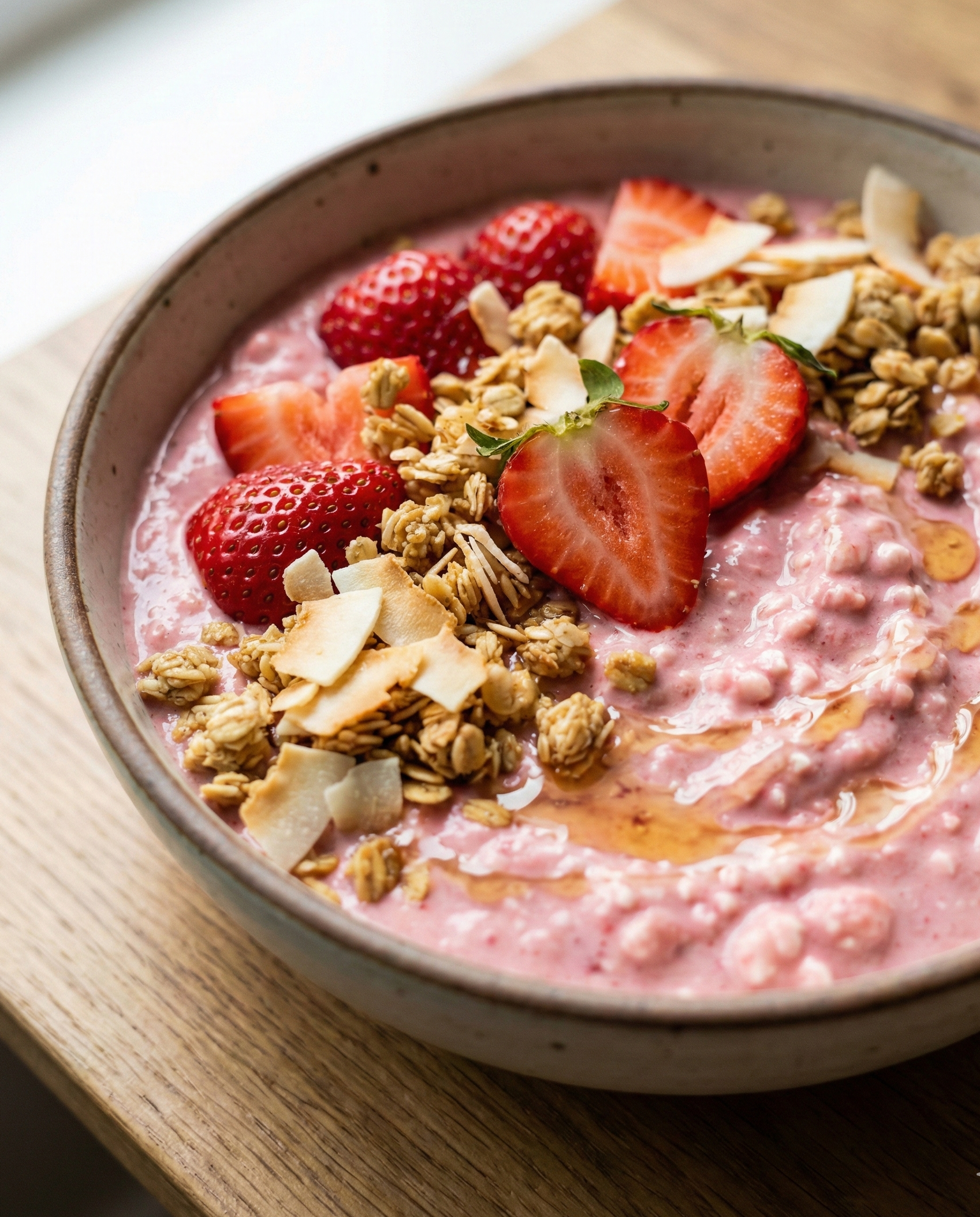Description (20–30 words): Thick, spoonable, and dessert-like—this strawberry bowl tastes like cheesecake filling. Cottage cheese adds creaminess and protein without weighing it down.