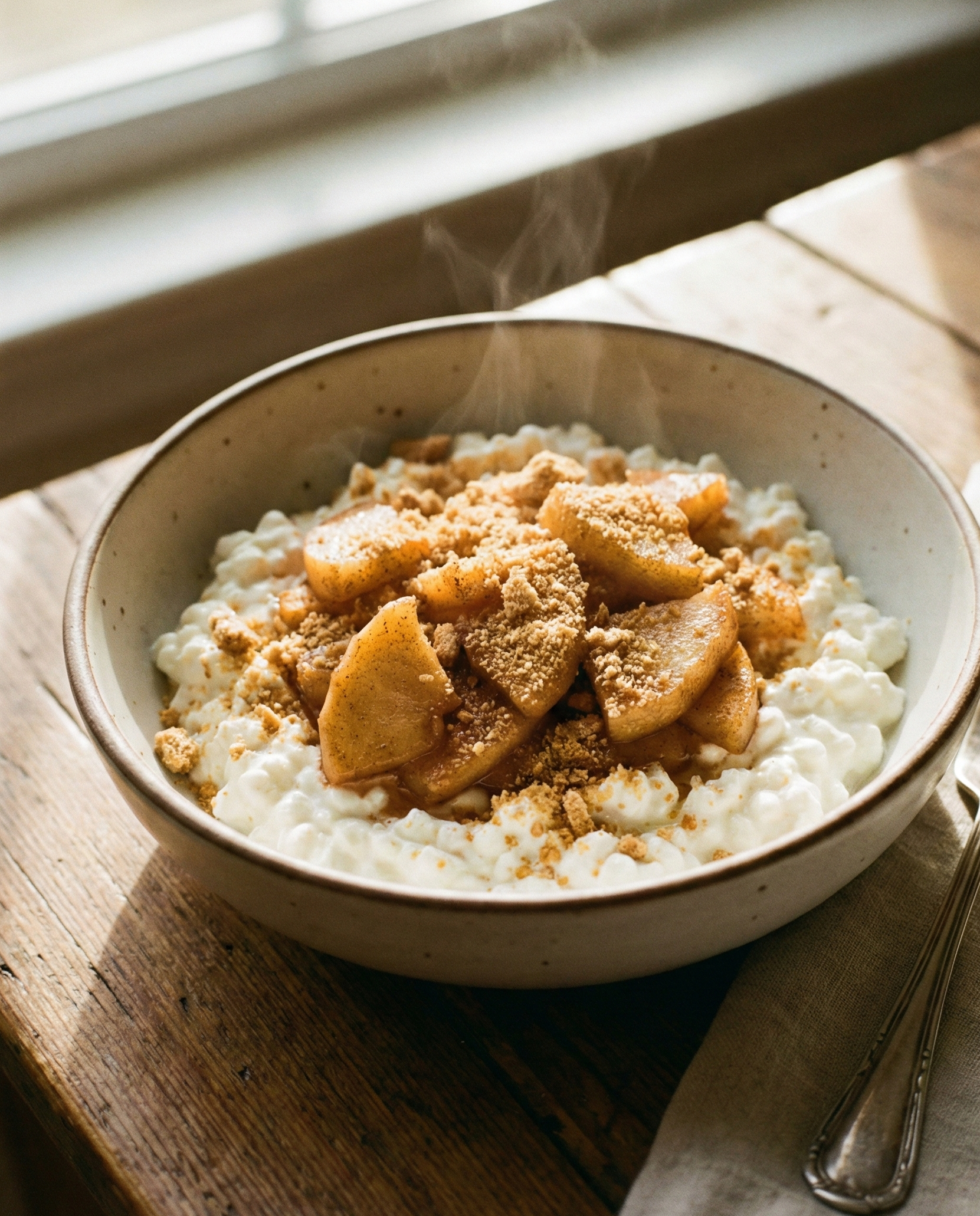 Description (20–30 words): Warm cinnamon apples over cool creamy cottage cheese gives big apple-pie energy—especially with crunchy crumbs on top. Cozy, sweet, and quick.