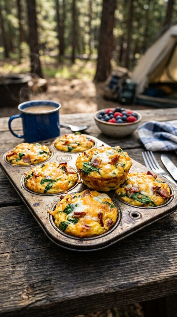 These portable, protein-packed egg muffins are perfect for a keto breakfast on the go. Loaded with spinach, cheese, and crispy bacon, they’re easy to make ahead and reheat over a campfire or camping stove. Low-carb and filling, these muffins are ideal for early mornings in the wild.