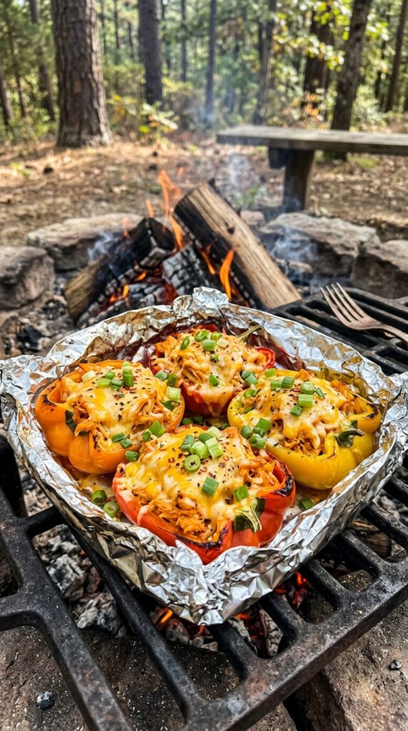 6. Wrap each stuffed pepper in foil and place on the grill or in embers for 10–15 minutes, until peppers are tender and cheese is melted.