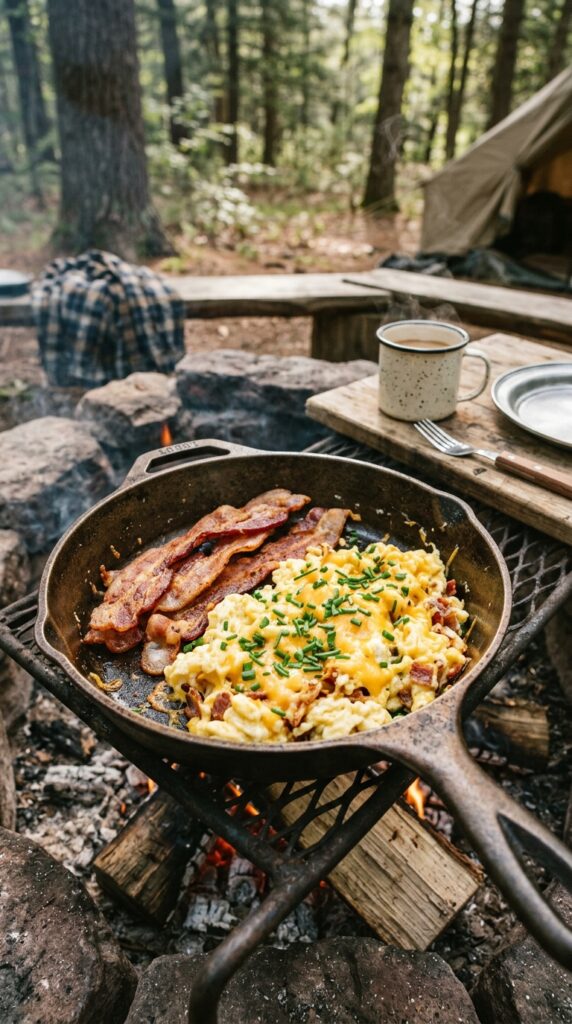 Start your camping day with a protein-packed, cheesy breakfast skillet. Crispy bacon, fluffy eggs, and melted cheese make this a filling, low-carb morning meal that’s easy to cook over a fire or camping stove. Perfect for fueling early hikes or lazy mornings outdoors.