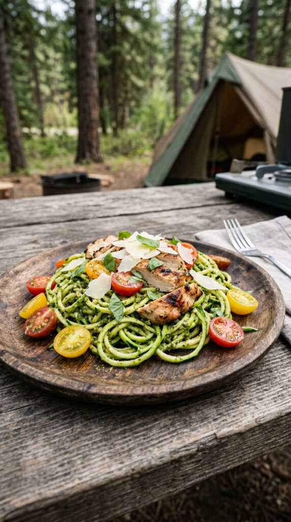 A light yet satisfying keto meal, combining tender grilled chicken with zucchini noodles tossed in fresh, aromatic pesto. Quick to prepare at camp, this recipe keeps carbs low while providing protein and flavor. Perfect for a refreshing dinner after a day of hiking or outdoor activities.