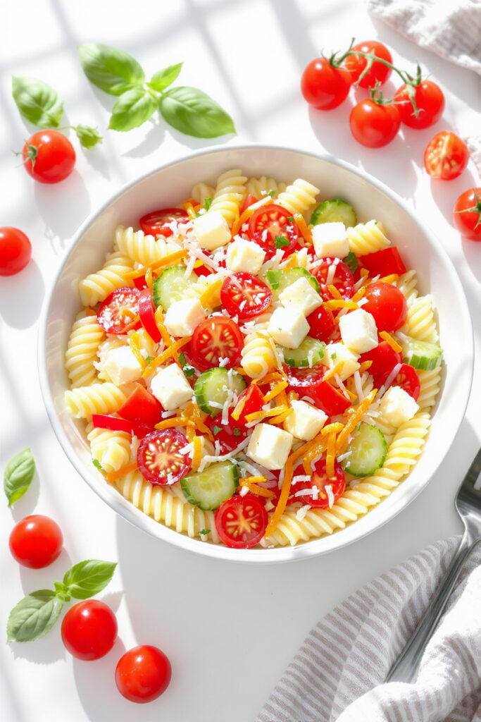This colorful pasta salad is a fresh and creamy side dish packed with crisp veggies and a light dressing. It’s easy to make ahead and perfect for BBQs, potlucks, or any summer gathering where you need a simple crowd-pleaser.