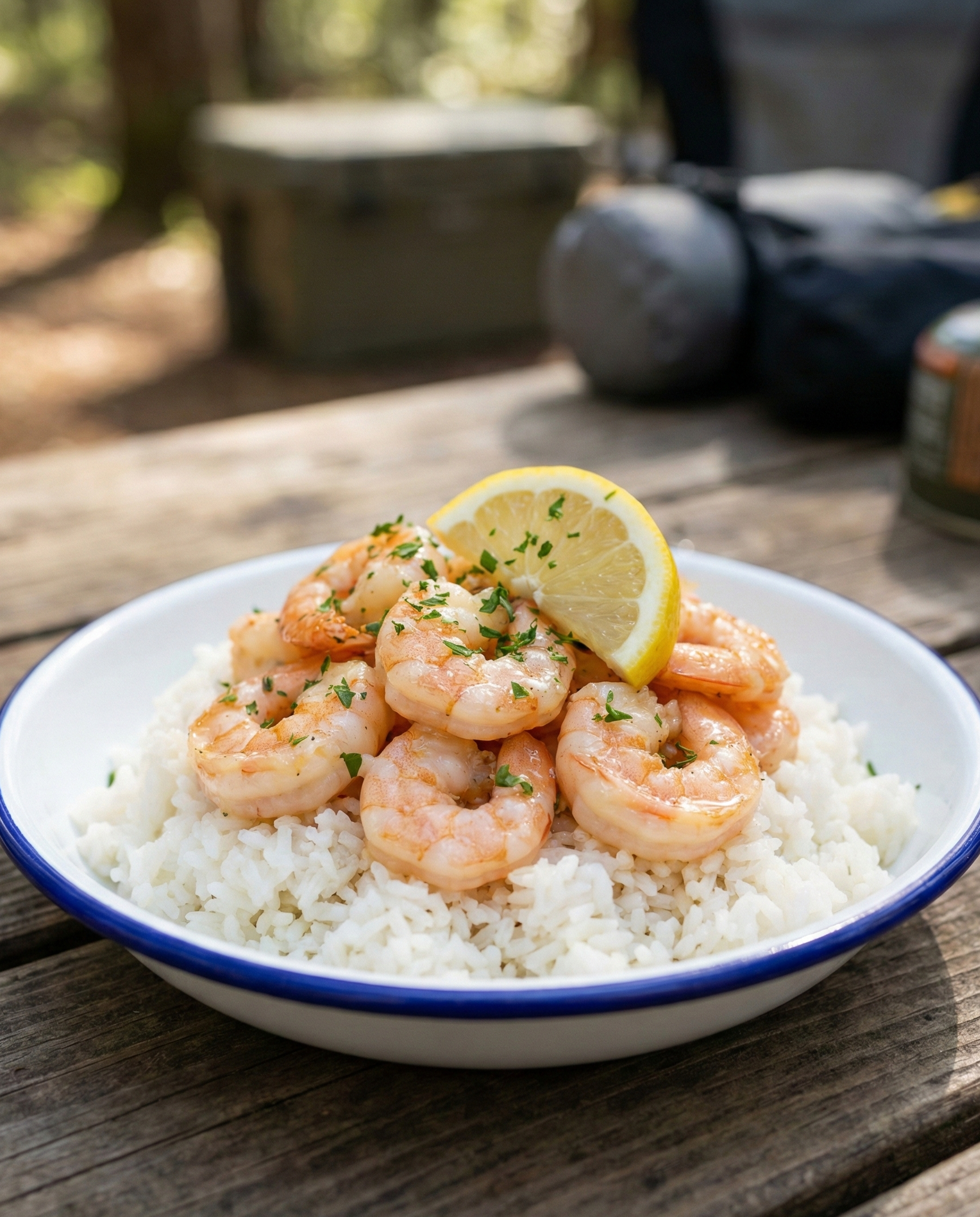 Description (20–30 words): Fast, fragrant, and surprisingly fancy for camp. Shrimp cooks in minutes in garlic butter, then gets spooned over quick rice for an easy win.