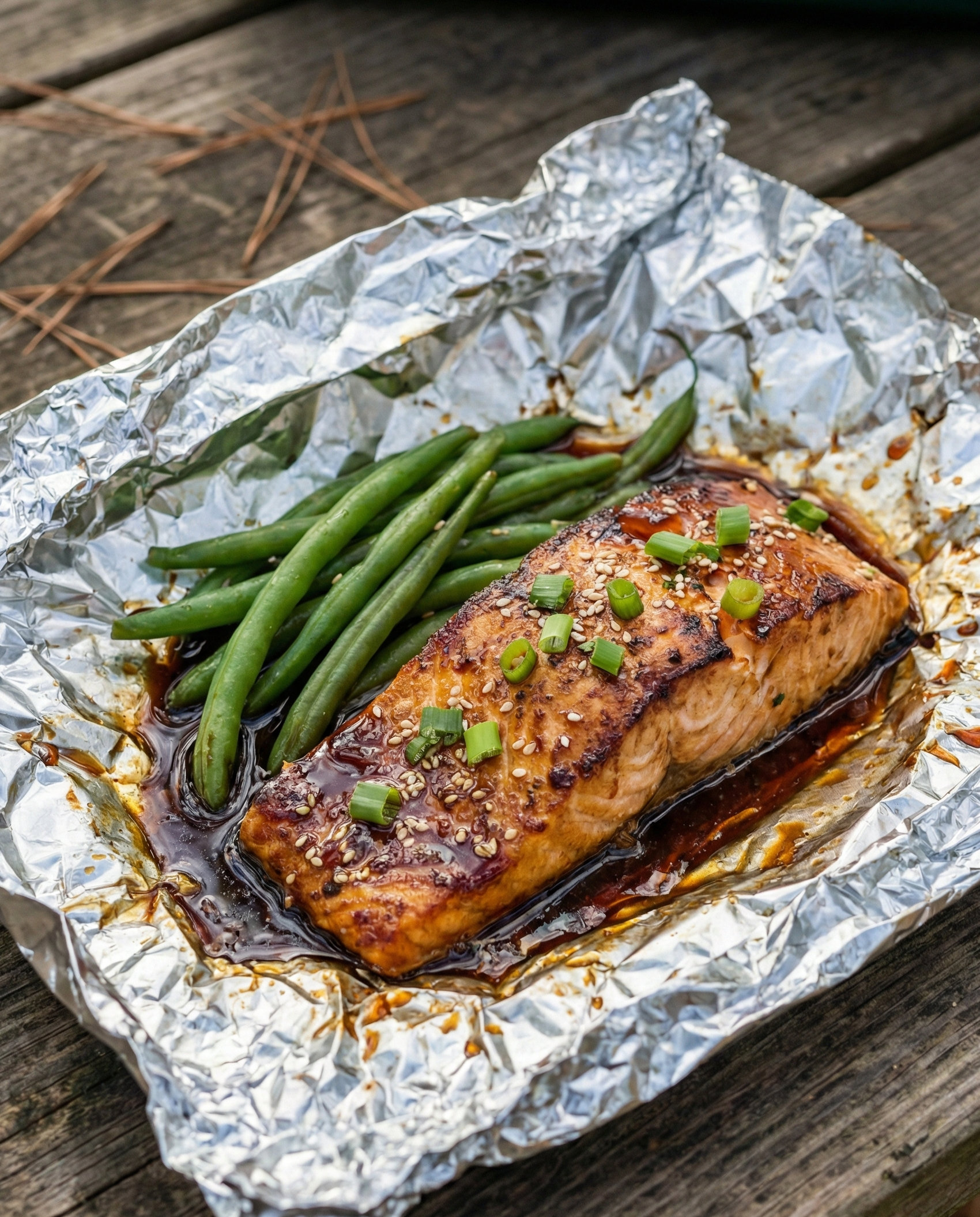 Description (20–30 words): Tender salmon stays moist in foil while honey-soy glaze turns sticky and savory. Add green beans or broccoli in the packet for a complete, clean dinner.
