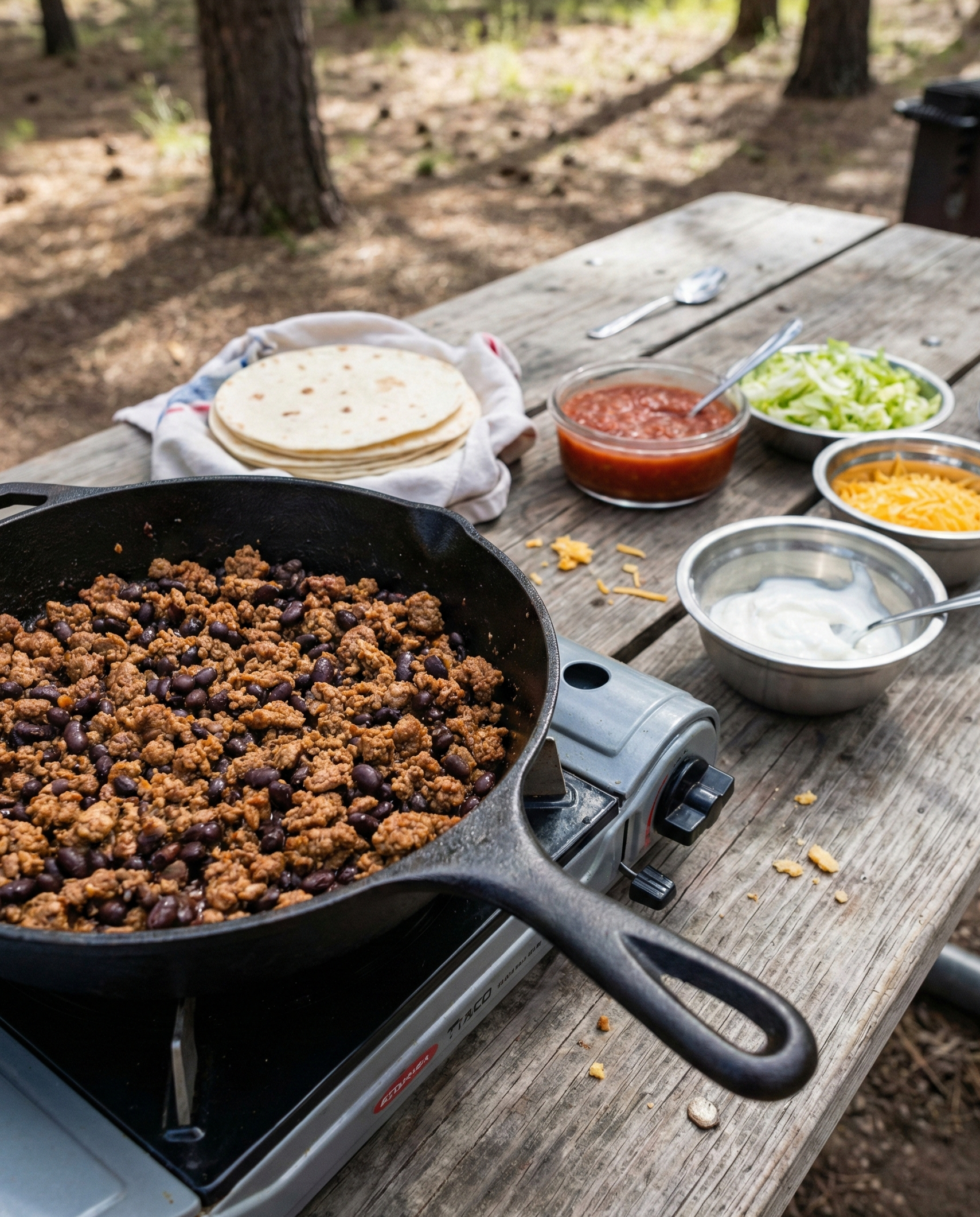 Description (20–30 words): Taco night is perfect for camping because everyone builds their own. A quick skillet filling plus simple toppings turns dinner into a fun, low-stress spread.