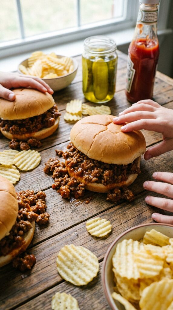 A nostalgic favorite with rich, tangy beef filling piled onto soft buns. It’s messy, fun, and always a hit with kids.