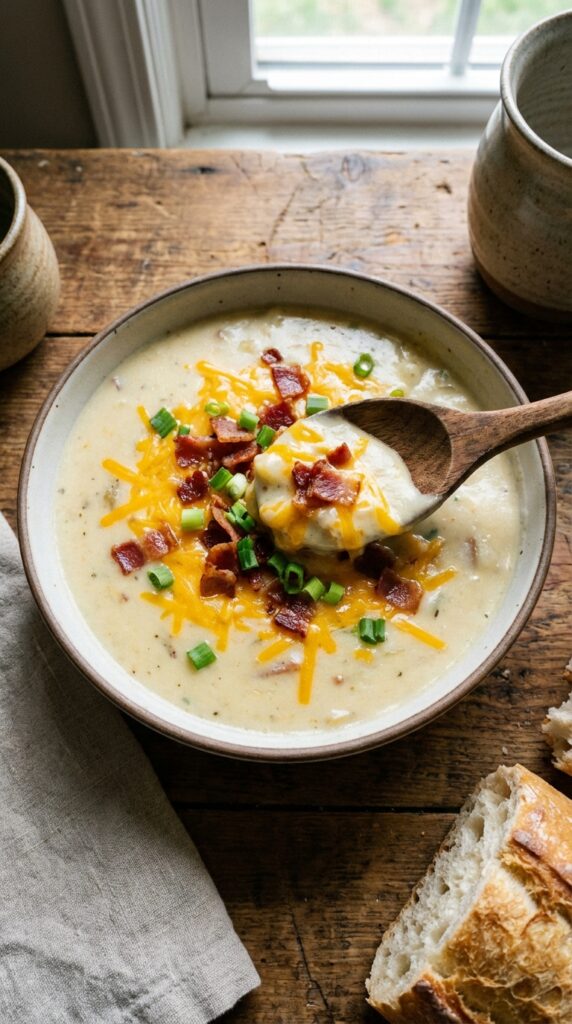 Creamy potato soup topped with cheese and bacon makes a cozy, family-pleasing dinner everyone will love.