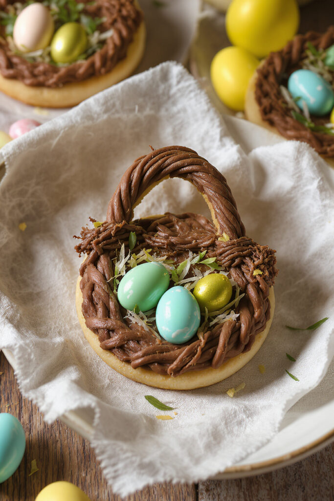 Adorable basket-weave designs piped on round cookies create miniature Easter baskets. Fill with tiny icing flowers or candy.