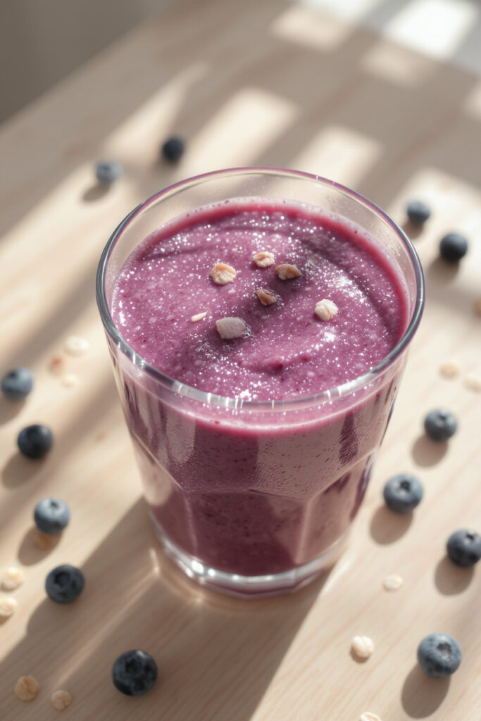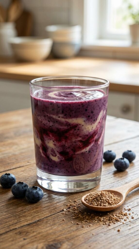 Blueberries bring deep flavor, almond butter adds richness, and flax seeds contribute omega-3s. This one is smooth, balanced, and quietly powerful for busy days.
