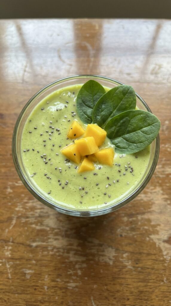 Bright mango makes greens taste refreshing, not “vegetable-y.” A squeeze of lime wakes everything up, and chia seeds add gentle thickness and fiber.