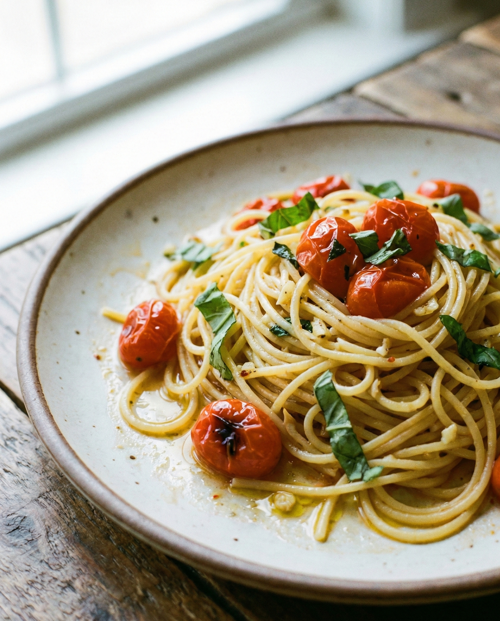 Description (20–30 words): Juicy tomatoes, basil, and olive oil make a fresh sauce while the pasta cooks. It’s light, summery-springy, and practically effortless.