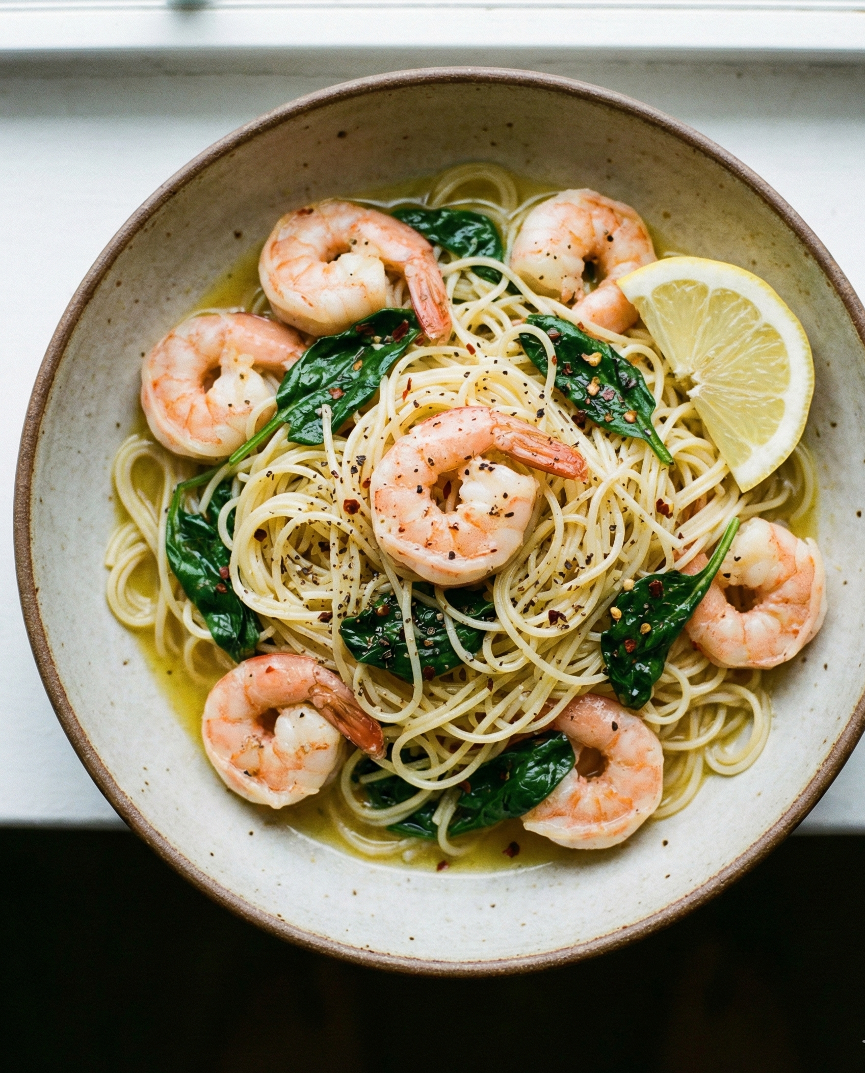 Description (20–30 words): Fast-cooking shrimp, garlic, and spinach come together in minutes. Angel hair makes it feel light, while lemon keeps the flavor sharp and clean.