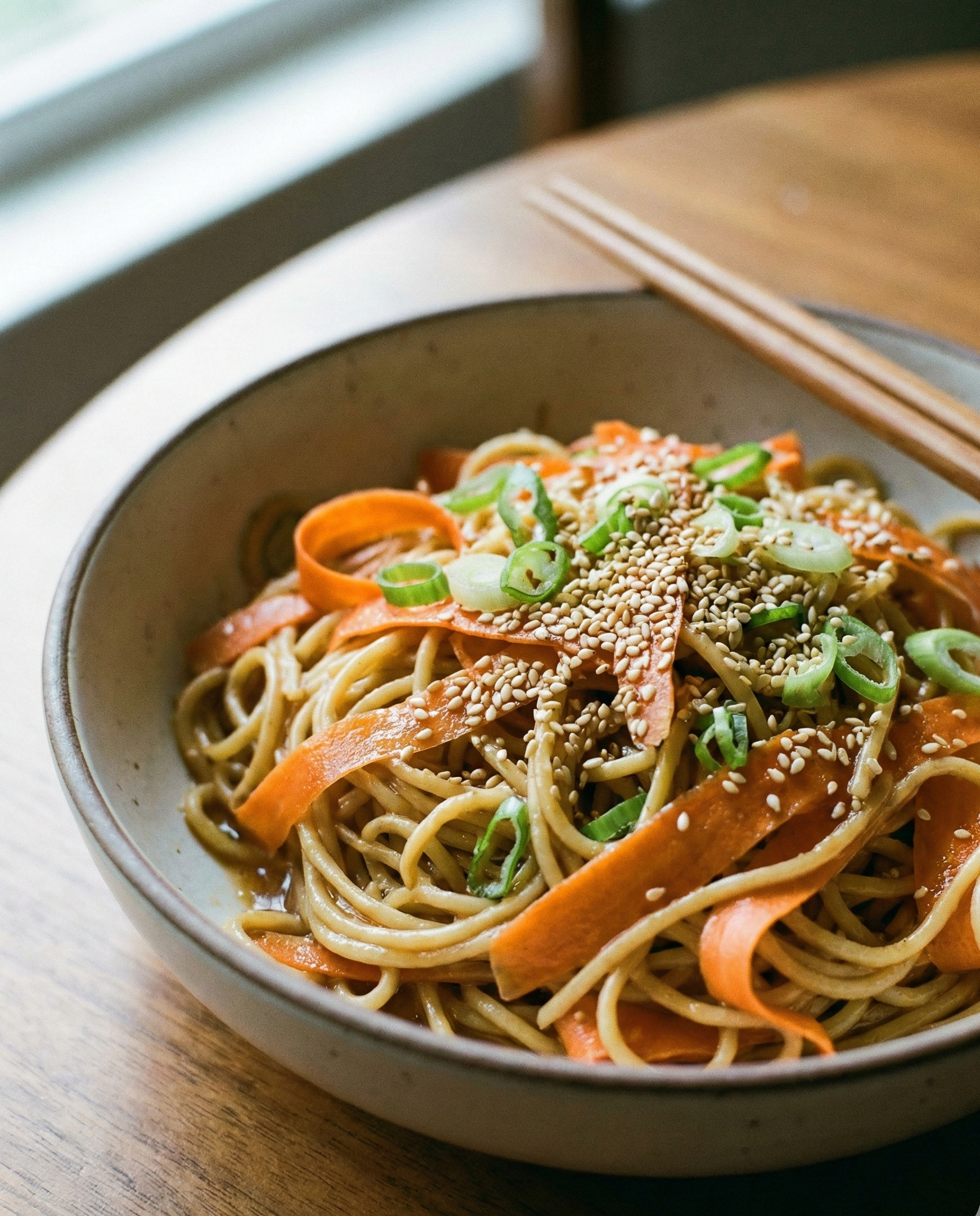 Description (20–30 words): A fresh, crunchy pasta bowl with carrot ribbons and a sesame-ginger sauce. It’s bright, lightly sweet, and great warm or chilled.