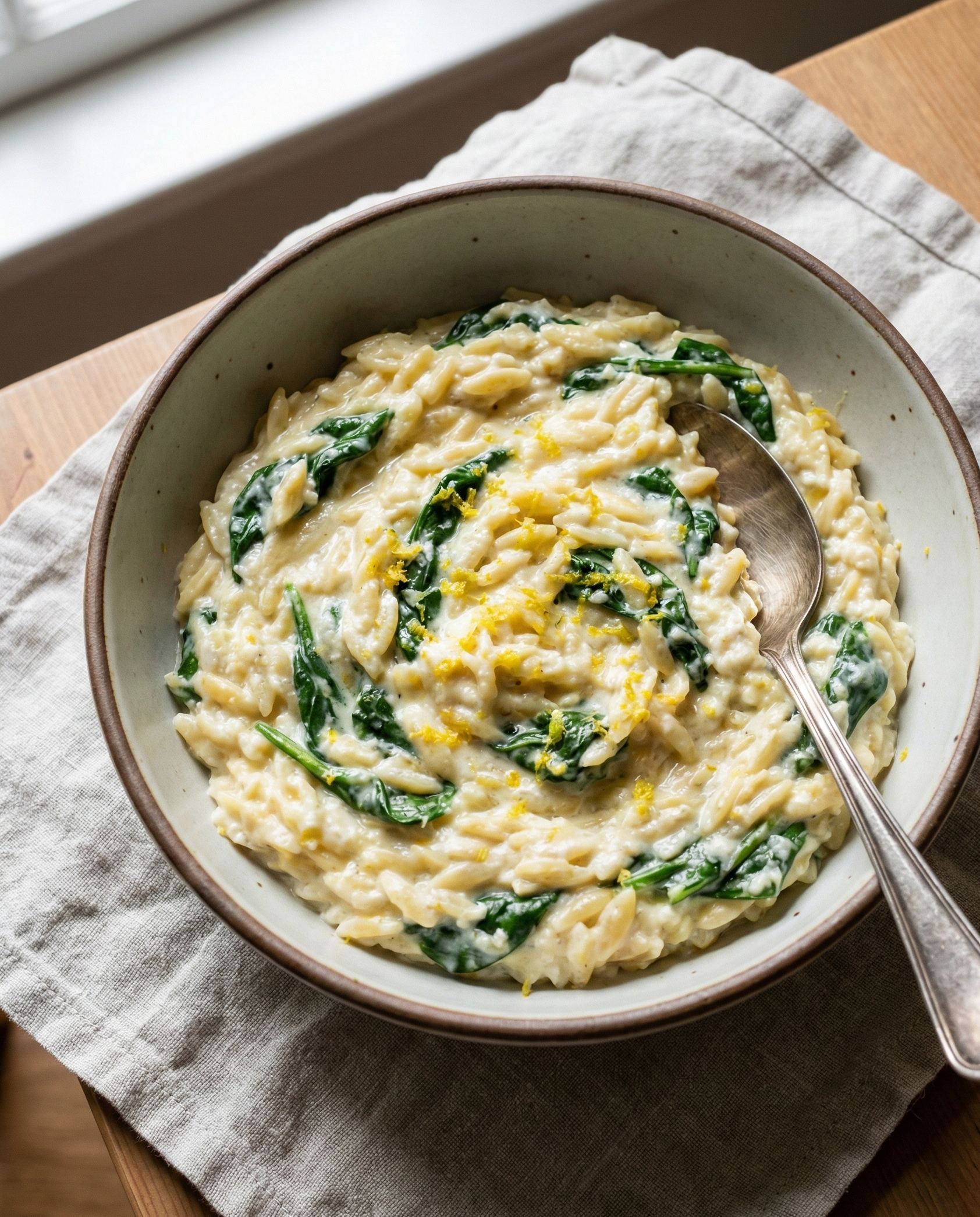 Description (20–30 words): Cozy but still light, this lemony orzo turns creamy with ricotta and wilting spinach. Great as a quick lunch or simple side.