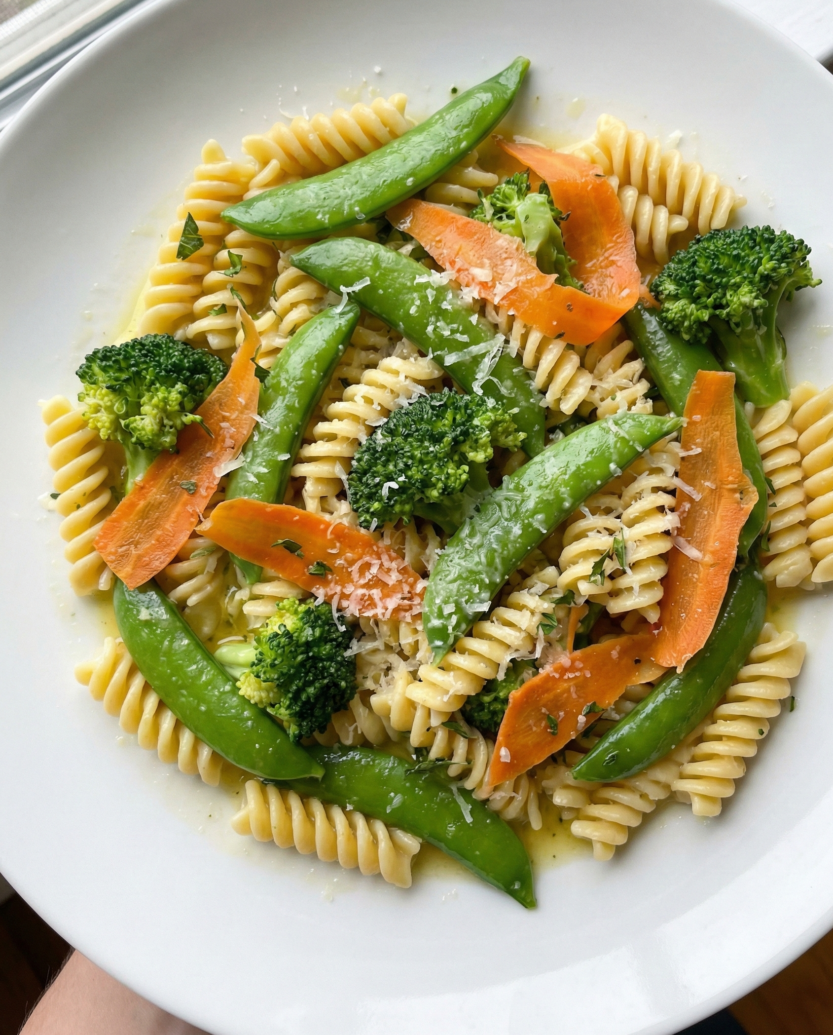 Description (20–30 words): A lighter primavera packed with snap peas, carrots, and broccoli in a glossy lemon-olive oil sauce—no heavy cream, just clean flavor.