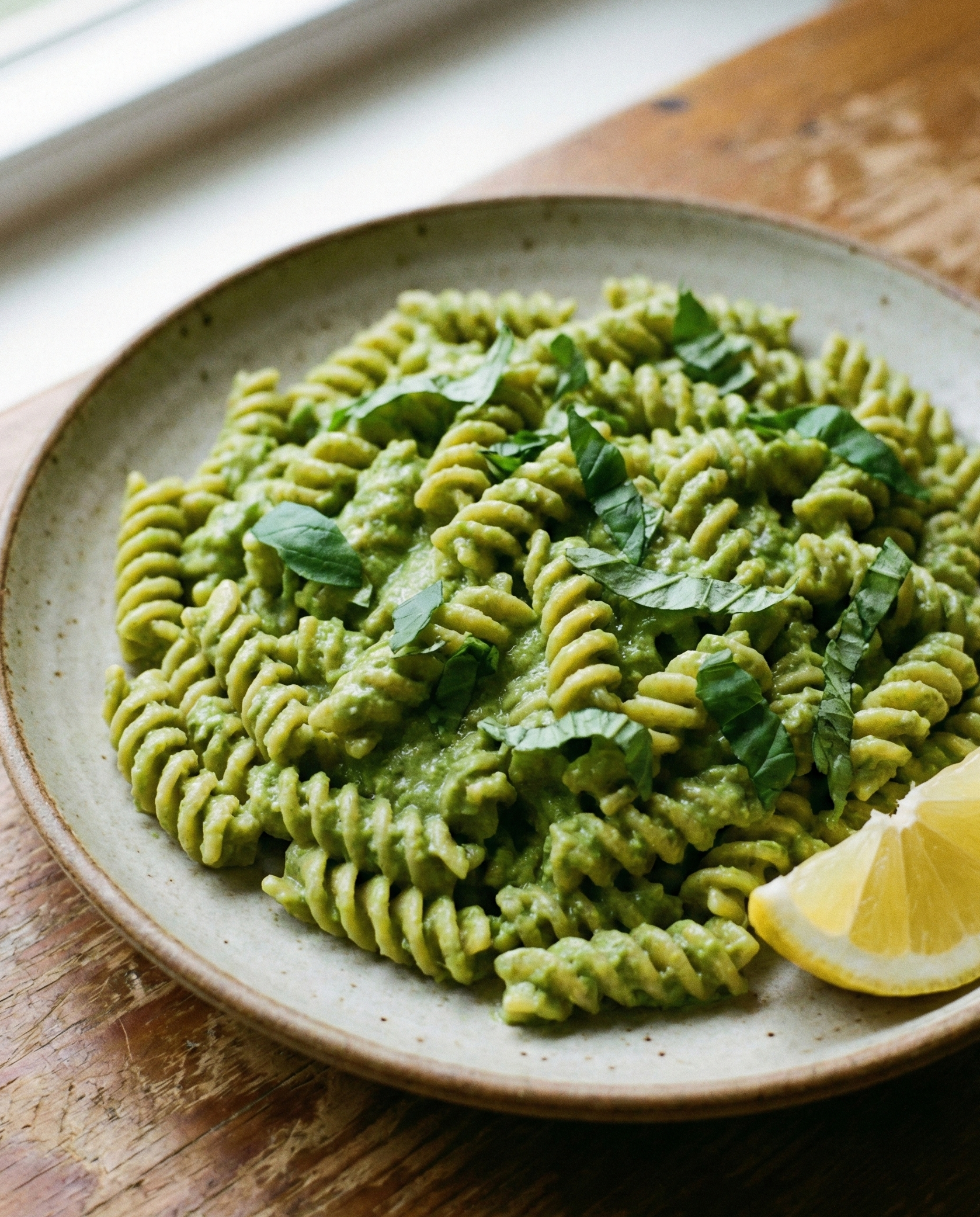 Description (20–30 words): Avocado and peas blend into a silky green sauce that feels indulgent but stays fresh. Best served immediately with extra lemon and herbs.