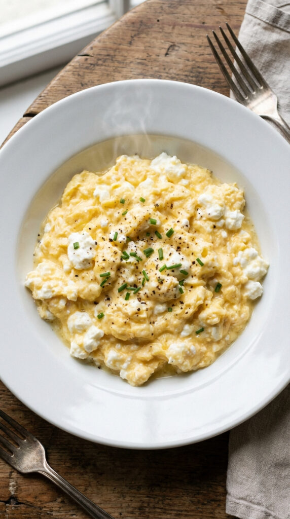 Soft scrambled eggs mixed with cottage cheese create a creamy, protein-packed breakfast that feels indulgent but stays light.