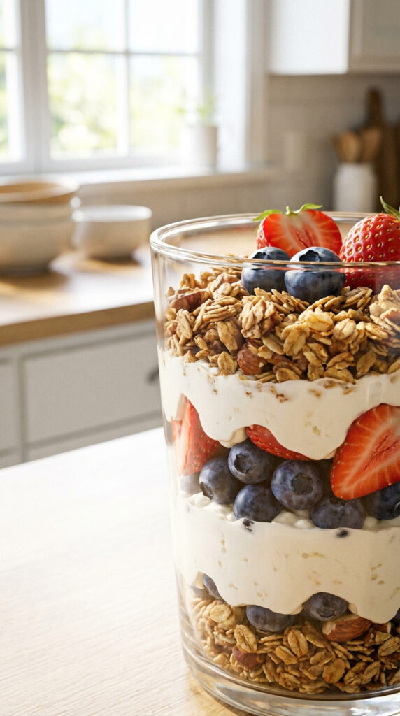 Layers of creamy cottage cheese, fresh berries, and crunchy granola make a refreshing, high-protein snack or breakfast option.