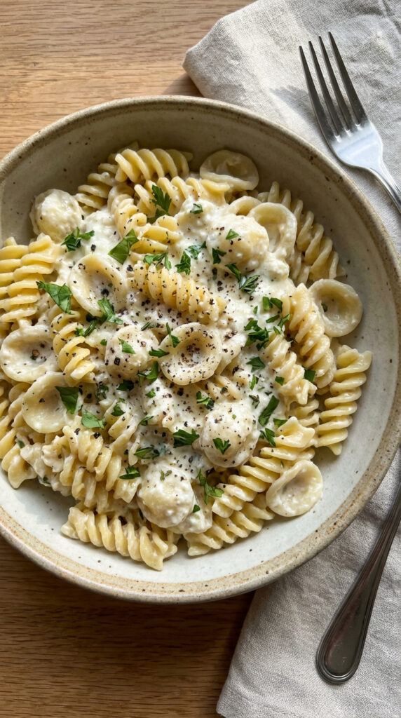 Blended cottage cheese creates a creamy, high-protein pasta sauce that feels rich and comforting while staying lighter than traditional cream-based sauces.