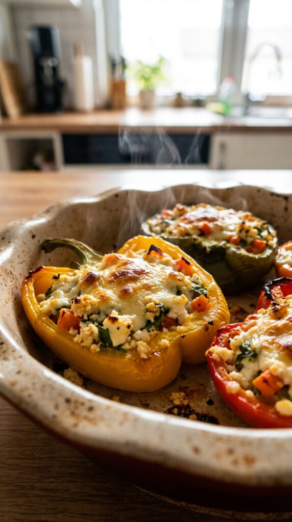 Colorful bell peppers filled with seasoned cottage cheese and vegetables create a hearty vegetarian meal loaded with protein and flavor.