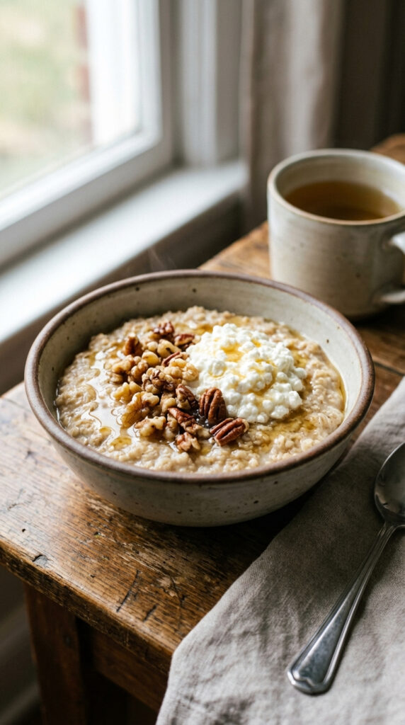 Warm oatmeal topped with cottage cheese adds creaminess and extra protein for a hearty breakfast that keeps you full longer.