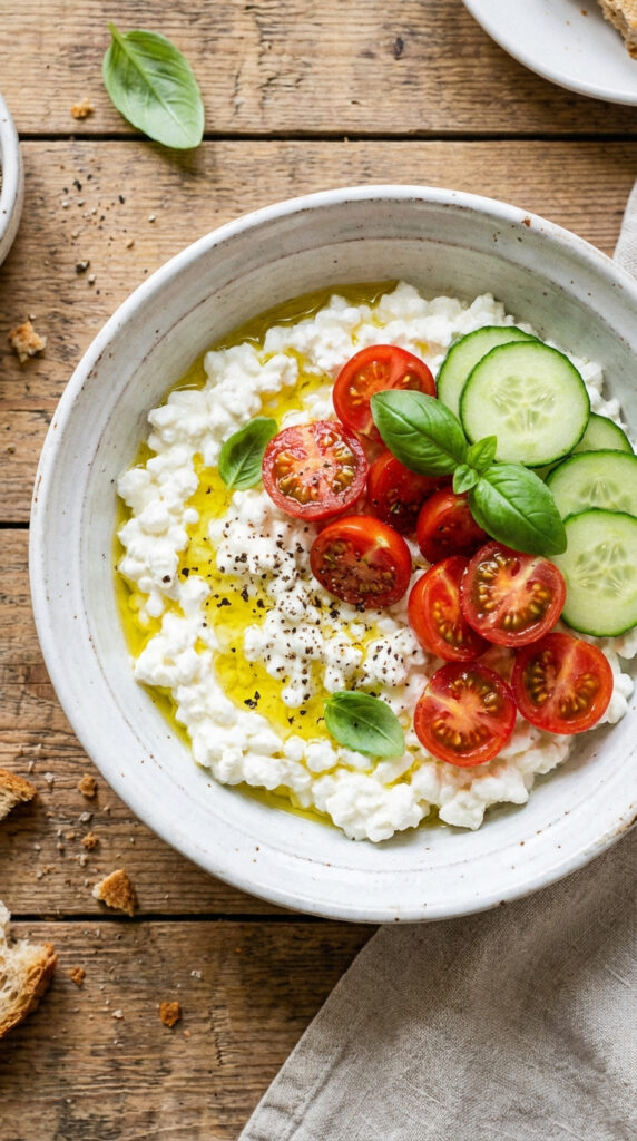 A simple savory bowl with cottage cheese, cherry tomatoes, cucumber, and olive oil makes a quick protein-rich meal.