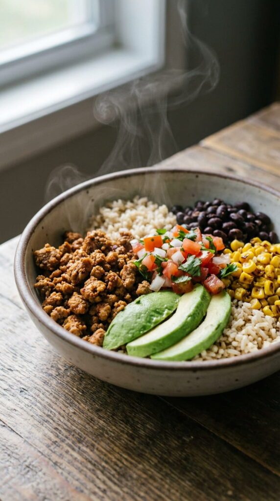 Juicy seasoned ground turkey served over rice with fresh toppings makes this bowl satisfying, colorful, and perfect for meal prep lunches.