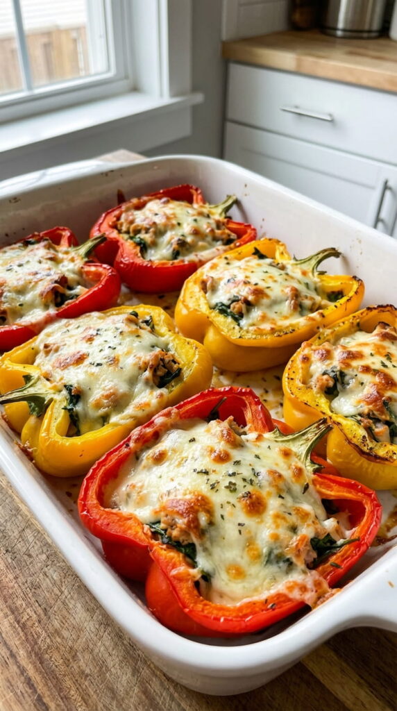 Colorful bell peppers filled with savory turkey and spinach create a protein-packed dinner that feels comforting yet light.