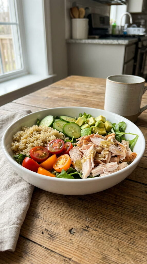 This balanced bowl combines lean turkey, fluffy quinoa, and fresh veggies for a high-protein lunch that keeps energy steady.