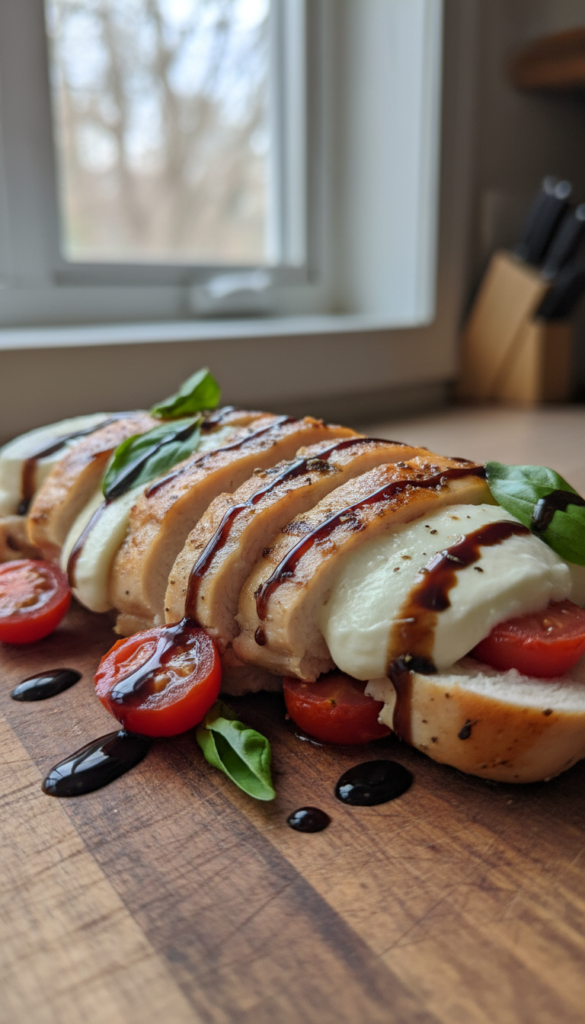 Sliced pre-cooked chicken with mozzarella, tomatoes, and basil. Drizzled with balsamic for a fresh, protein-packed Mediterranean-style meal.