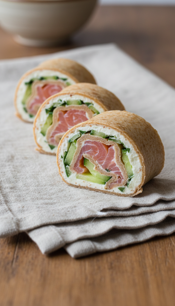 Soft tortilla filled with smoked salmon, cream cheese, and crisp cucumbers. It’s flavorful, filling, and requires zero cooking time.