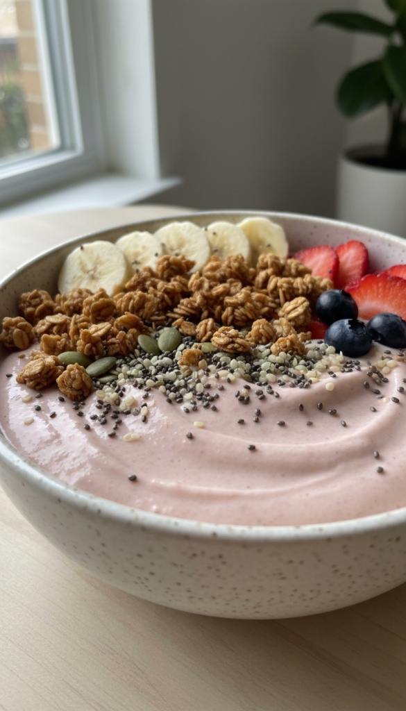 Thick blended smoothie topped with nuts, seeds, and fruit. A refreshing, no-cook meal that’s both energizing and protein-rich.