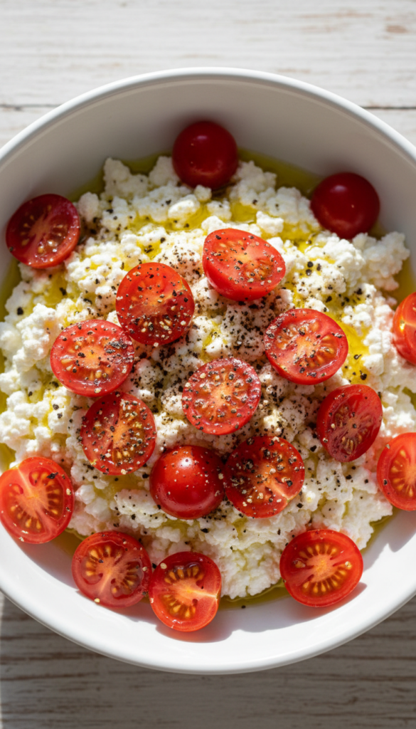 Cool cottage cheese paired with juicy tomatoes and black pepper. A savory, protein-rich bowl with refreshing summer vibes.