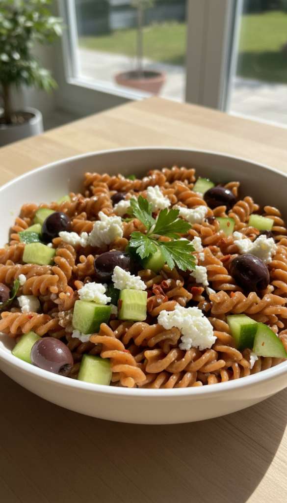 Pre-cooked lentil or chickpea pasta mixed with feta, olives, and cucumbers. A hearty no-cook meal that feels fresh and satisfying.