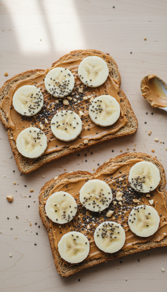 Whole grain toast topped with peanut butter and chia seeds. A simple, satisfying no-cook meal with a solid protein boost.
