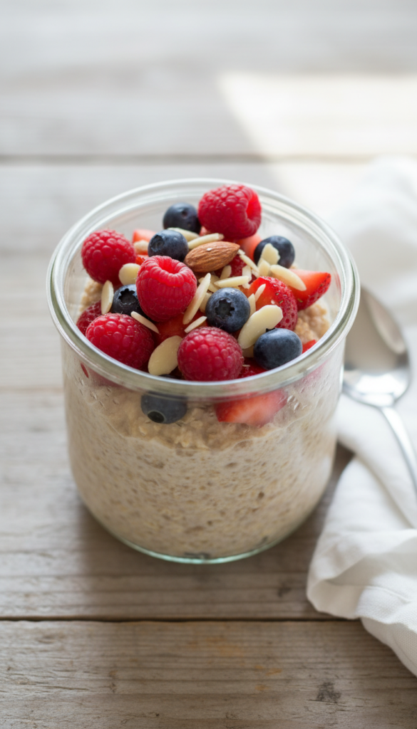 Oats soaked overnight with milk and protein powder, topped with fruit and nuts. Creamy, filling, and ready straight from the fridge.