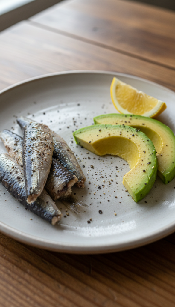 Canned sardines paired with creamy avocado and lemon. Simple, nutrient-dense, and packed with protein and healthy fats.