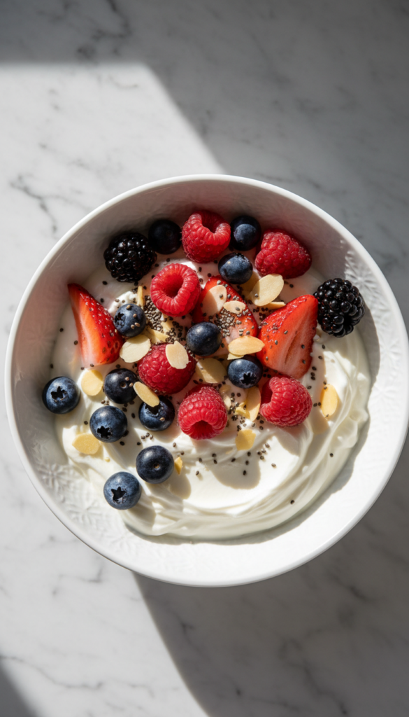 Creamy Greek yogurt topped with nuts, seeds, and fresh berries. It’s thick, satisfying, and loaded with protein for a refreshing no-cook meal.