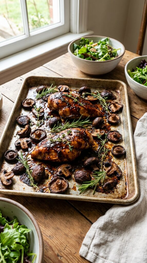 Tender chicken glazed with balsamic vinegar roasts alongside earthy mushrooms for a savory, high-protein dinner with rich flavor.