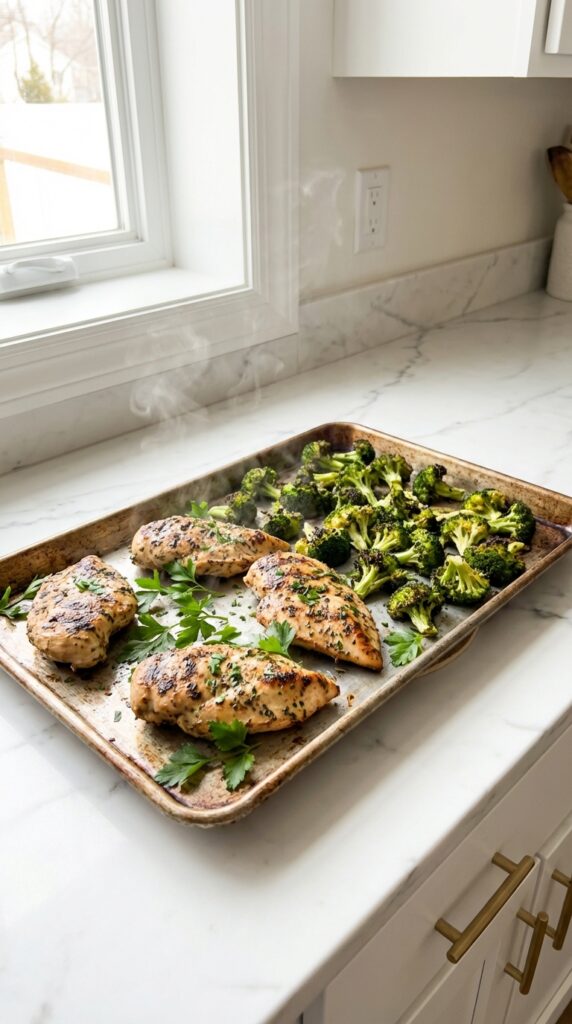 Juicy garlic herb chicken breasts roast alongside tender broccoli for a simple, protein-packed dinner that’s flavorful, filling, and perfect for busy weeknights.