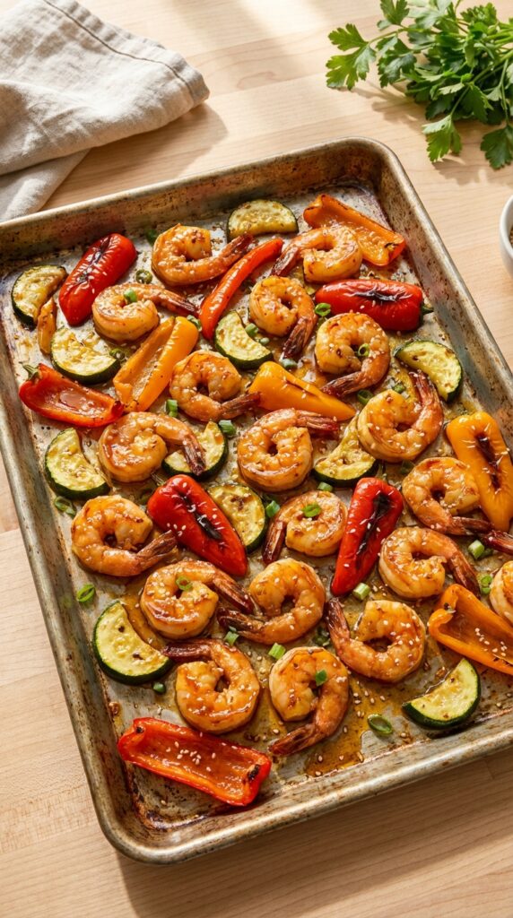 Tender shrimp glazed in honey garlic sauce roast quickly with colorful vegetables for a sweet, savory, protein-packed meal.