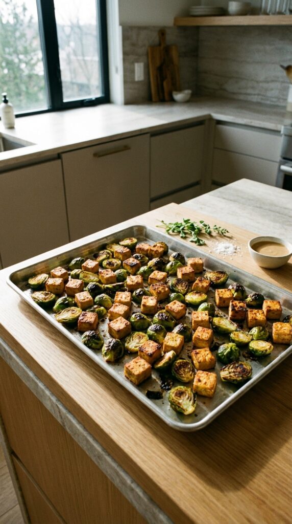 Crispy baked tofu paired with roasted Brussels sprouts offers a plant-based protein dinner that’s hearty, flavorful, and satisfying.