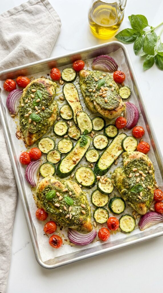 Tender chicken coated in pesto roasts beautifully with fresh zucchini for a vibrant, high-protein dinner full of fresh flavor.