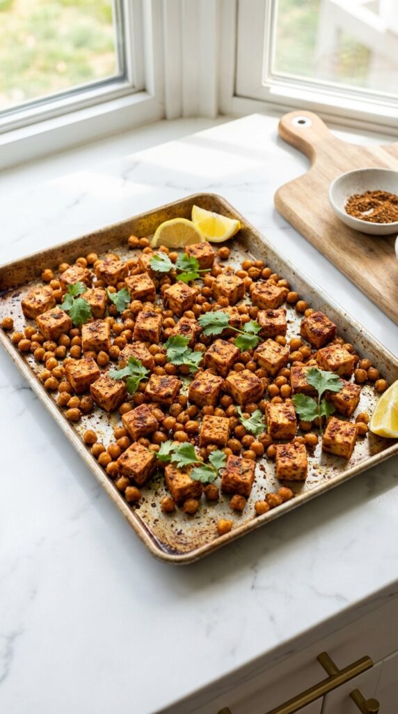 Roasted tofu and chickpeas tossed in bold spices create a satisfying plant-based dinner that’s high in protein and full of flavor.